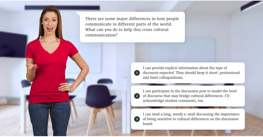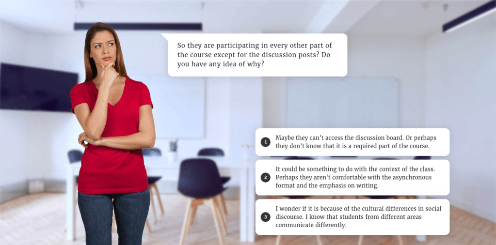 Scenario 1: Non-native English speaking students in an online course were not completing the discussion posts. This is an example of a successful scenarios navigation: