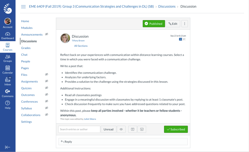 Learners started in Canvas with an introduction to the topic and learning goals. After participating in the embedded Articulate Rise lesson, they showed mastery of the final learning goal in a discussion post:
