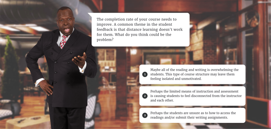 Scenario 2: Student feedback revealed that online learners felt that their online literature course focused too much on reading assignments and writing essays, and wanted an interactive component. This is an example of an unsuccessful scenarios navigation: