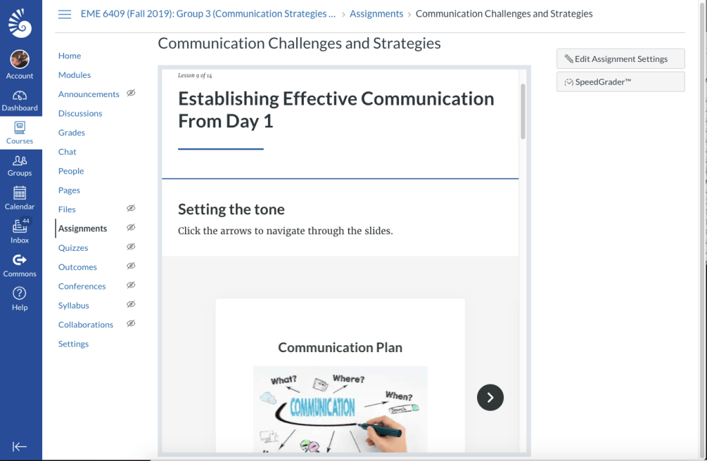 My section focused on communication strategies. As it was halfway through the lesson, I tried to organize content into smaller interactive chunks; for example, rather than reading a paragraph about building a communication plan, they clicked through 5 embedded slides with one or two sentences each.